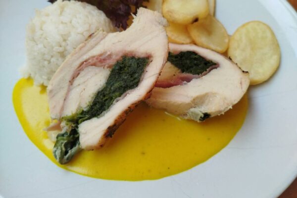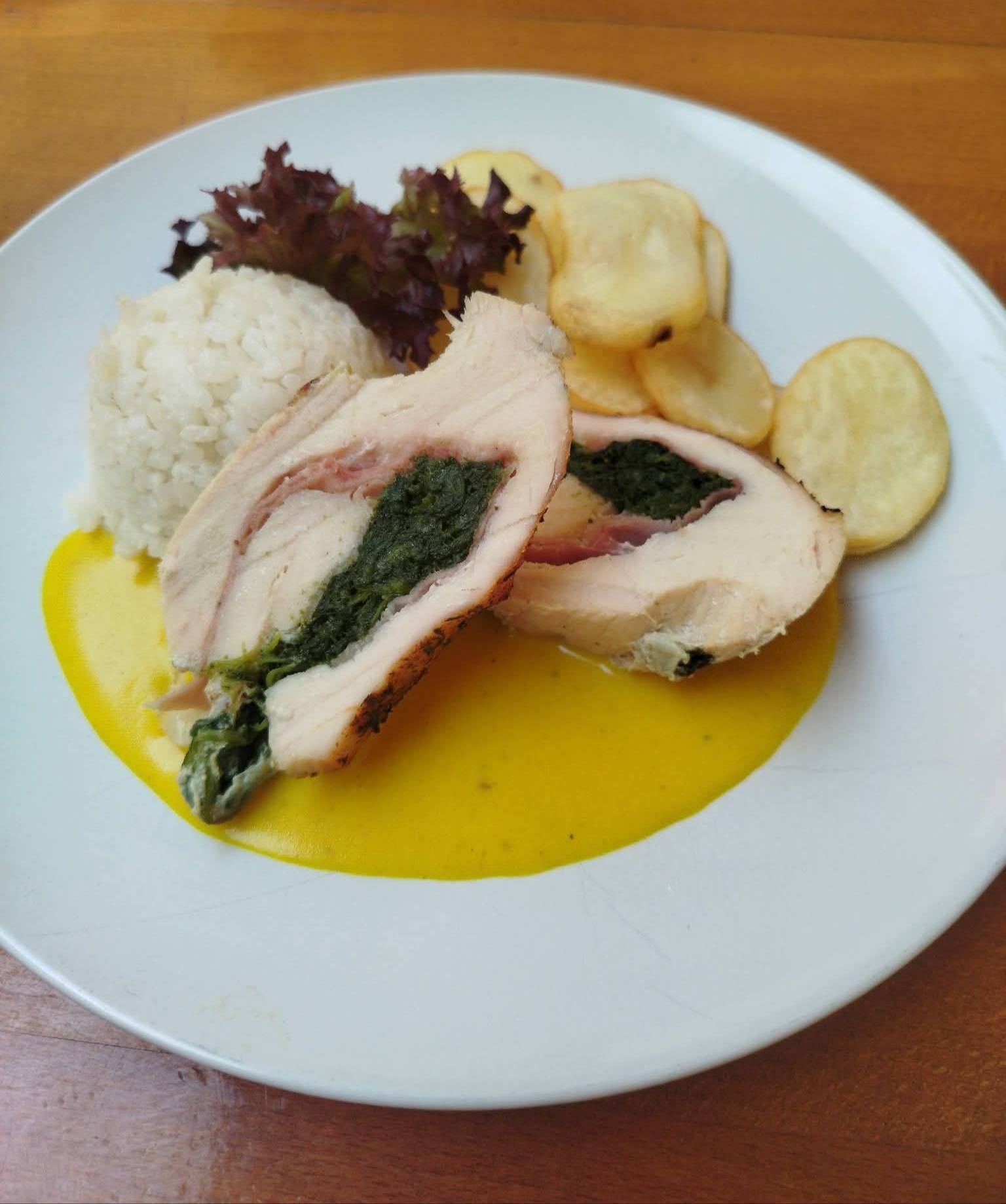 1. 120g 😋🐥🍛Kuracia rolka plnená prosciuttom🍖 a špenátom na smotanovo – kurkumovej omáčke (½ ryža🍚, ½ vyprážané zemiakové plátky🥔) /1,7/