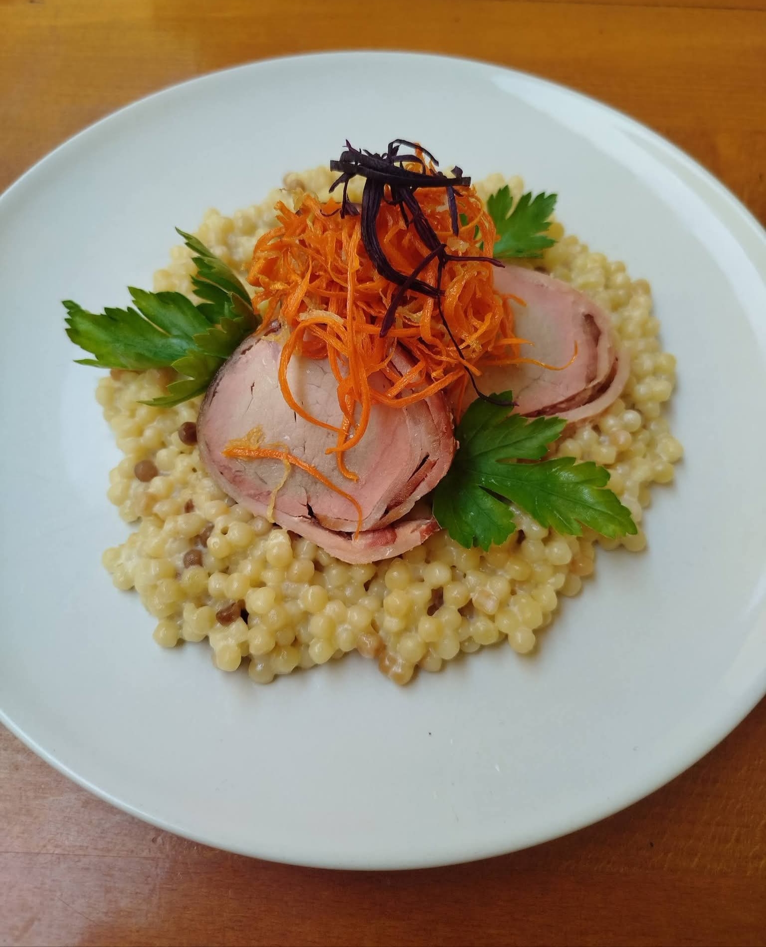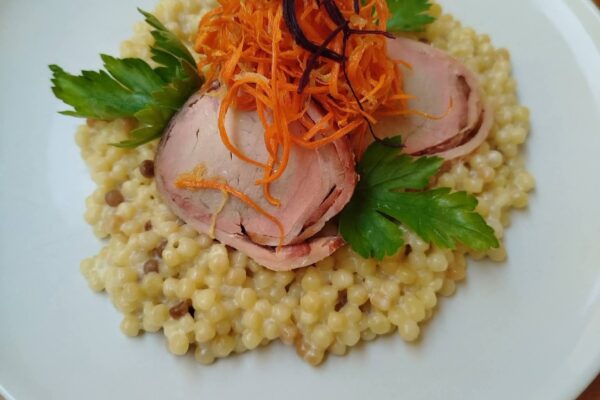2. 120g 🐖😋🐖Bravčová panenka v slaninovom kabátiku 🥓na krémovom rizote🥘 z tarhone dozdobené zeleninovou slamou /1,7/